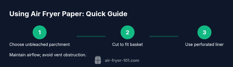 According to Air Fryer 101, the safest and most reliable path to crisp, non-sticky results starts with the right paper. Understanding what to use in air fryer paper helps you avoid waste, smoke, or soggy bits. In practice, most home cooks rely on parchment paper that is unbleached and heat-rated for baking and cooking. Perforated parchment options, special air fryer liners, and even minimal contact methods (like a thin sheet trimmed to fit) can protect the basket while preserving airflow. The goal is to keep a barrier between food and the basket surface without blocking the rapid hot air that makes air fryers effective. Foods like fries, chicken nuggets, and vegetables often benefit from a protective layer that prevents sticking, reduces cleanup, and minimizes absorbed oil.