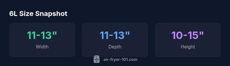 The 6L label refers to the total internal volume of the cooking chamber. In practical terms, the external footprint of most 6L air fryers sits in the typical 11–13 inch width range, with a depth around 11–13 inches and a height of roughly 10–15 inches. These figures vary by design, especially for units with curved edges or chrome trim. If you're moving from a 4–5L model, expect noticeable but manageable growth in width and height. The usable basket area—the space that actually holds food—tends to be about 7–9 inches in diameter, depending on the basket shape and whether a tray or rack is included. When you compare, remember liters measure volume inside the cavity, while width and depth describe the machine’s physical footprint on the counter. A practical way to visualize is to think of the unit occupying a roughly square area of about 11 by 11 inches on the counter, with extra height for the handle and lid. Also consider the door orientation; some models pull down like a microwave, others open from the top.