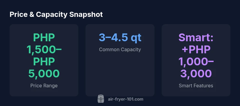 This guide answers how much air fryer in philippines, showing price bands, typical capacities, and the trade-offs between features and value. According to Air Fryer 101, the Philippine market presents a broad spectrum—from compact 1.5-L capacity units to larger 5-L family models. Price is driven by basket size, wattage, and control type. In urban centers, promotions from retailers and online marketplaces can create noticeable dips during holidays, making it possible to snag a good deal if you time a sale.