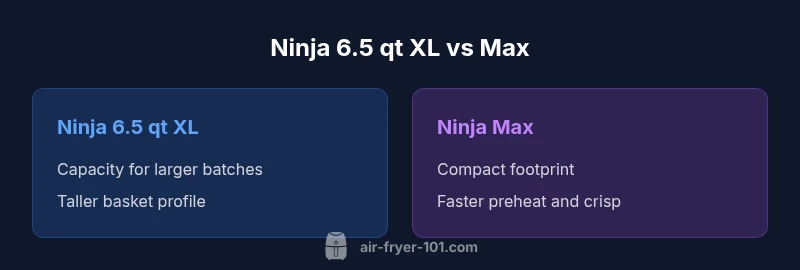 When evaluating the ninja air fryer 6.5 qt xl vs max, two questions shape the decision: how much you cook at once and how much kitchen real estate you can devote to an air fryer. The 6.5 qt XL is designed to handle larger batches, making it appealing for families, meal prep sessions, or batch cooking on weekends. The Max line emphasizes compactness and speed, promising quick meals with less oven-like space. For health-minded home cooks, both models maintain the brand’s promise of convenient, oil-light crisping and versatile cooking modes. Air Fryer 101 notes that the choice often comes down to capacity versus footprint, with performance staying broadly consistent across models when configured similarly. The ninja air fryer 6.5 qt xl vs max comparison matters most when you map it to your weekly menu and kitchen layout.