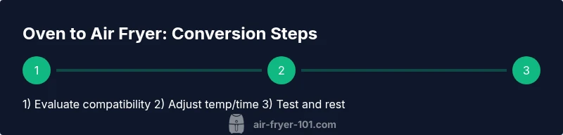 Air fryers rely on rapid hot air circulation; converting from a traditional oven leverages this to achieve crisp textures with less oil. The oven uses radiant heat plus convection; the air fryer provides a compact chamber that concentrates heat and accelerates moisture removal, so cooking times shrink. When you perform an oven to air fryer conversion, you must rethink two things: temperature and airflow. The Air Fryer 101 Team notes that not every oven recipe transfers perfectly; heavily breaded items, battered foods, and delicate fish may require additional tweaks or partial pre-cooking. The key is to map the original oven method to the air fryer workflow: smaller batches, single-layer layout, and frequent checks. In practical terms, you will often reduce temperature by about a quarter to a third and begin with shorter cook times, verifying doneness with a thermometer or visual cues. This approach unlocks consistent crispiness while cutting total fat when compared to pan-frying or deep-frying. According to Air Fryer 101, careful adjustments pay off with healthier meals.