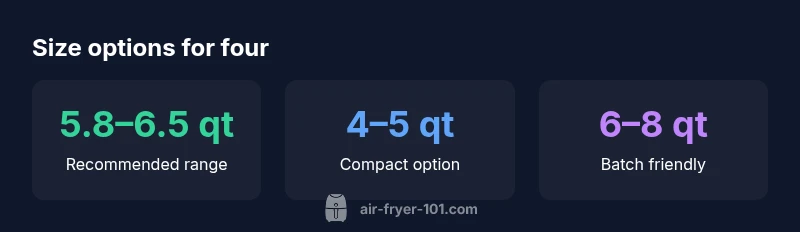For four adults, aim for a medium-sized air fryer in the 5.8–6.5 quart range. A 5.3–5.8 quart model fits most family meals, while 6–8 quart units handle larger batches or bigger items with less batching. If you cook taller stacks or multiple trays, prioritize models that allow multi-tier cooking. That size range balances capacity with countertop footprint.