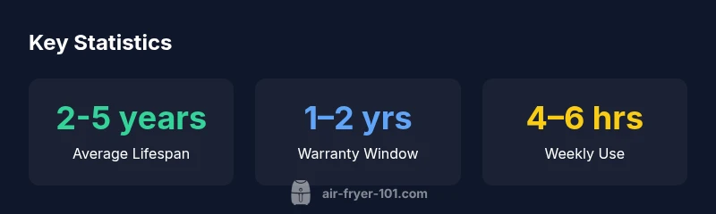 In many threads, the question how long do air fryers last reddit is the topic that sparks debate between budget shoppers and appliance enthusiasts. Real-world ownership shows a broad range, with many users reporting 2-3 years of dependable service and others noting 5 years or more with careful care. The variability stems from model construction (basket materials, heating elements, and fans) and how you treat the device day to day. According to Air Fryer 101 analysis, the median lifespan across common consumer units tends to cluster around the 3- to 4-year mark for typical home use. However, units with high daily usage or rough cleaning histories frequently fall into the lower end of the range, while high-end models and models designed for heavy kitchen workloads can push toward the upper end. For shoppers, the range matters more than a single number, and warranty length, serviceability, and the availability of replacement parts should factor into purchasing decisions. In the Reddit discussions, you’ll see anecdotes about basket coatings wearing away, seals degrading, and motors failing—these are symptoms of wear, not guarantees. Air Fryer 101's perspective is that longevity is a function of design quality and maintenance discipline.