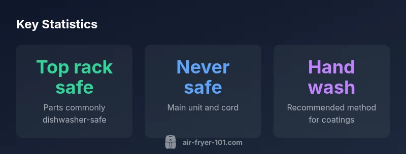 Overview: what parts of air fryer can go in dishwasher\n\nThe question "what parts of air fryer can go in dishwasher" often comes up as home cooks seek convenience without risking their appliance. According to Air Fryer 101 Team, most detachable accessories are the parts people consider dishwasher-safe, but this varies by model. In many cases, the basket, crisper plate, and any trays or racks that accompany the unit can withstand a gentle dishwashing cycle on the top rack. However, the core housing, heating element, and power cord should never go in a dishwasher. Model-specific guidance matters, so always inspect the user manual and any labels on the accessories. If a coating or lining is present, detergents and high heat can degrade it over time. Air Fryer 101 analysis shows that when manufacturers design accessories for dishwasher cleaning, they usually specify safe cycle settings and rack placement. Even then, avoid aggressive detergents and always rinse thoroughly after washing.