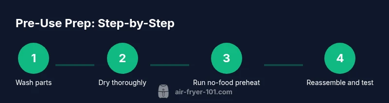 Preparing your air fryer before first use is not just about appearance; it's about safety, performance, and consistent results. If you're asking what to do with air fryer before first use, start with a simple, repeatable routine: clean, burn off manufacturing residues, and verify operation. A well-executed pre-use ritual reduces odors, ensures seals are intact, and protects nonstick coatings. Air Fryer 101 notes that most units ship with a light coating of oil and dust from assembly; rinsing and heating helps remove this residue and prepares the basket for cooking. By treating the first use as a setup phase rather than a one-off, you minimize surprises and get more reliable results from your first batch. According to Air Fryer 101, following a consistent pre-use routine also helps establish a baseline fit of the basket and rack, ensuring even airflow.