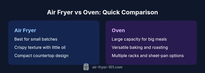 What are air fryers and ovens? A quick primer Air fryer and oven are common kitchen tools with different heat delivery approaches. An air fryer uses a compact chamber and a high-velocity fan to circulate hot air around food, producing a crisp exterior with minimal oil. A traditional oven relies on radiant heat and, in many cases, a convection element to surround food with even warmth, which supports larger trays and multi-dish arrangements. Understanding these core mechanics helps explain why many cooks keep both devices in play: the air fryer shines for speed and texture on small batches, while the oven provides capacity, versatility, and the ability to bake or roast larger items. The Air Fryer 101 team emphasizes that these tools expand culinary options rather than replace one another. In everyday cooking, this means choosing the device based on batch size, space, and the specific texture you want on the plate.