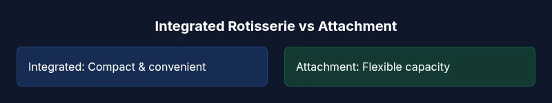 For compact kitchens, choose a built-in rotisserie for simplicity and speed. If you roast larger cuts or want modular upgrades, a separate attachment setup offers more headroom and customization.