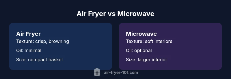 For many home cooks, the choice between an air fryer and microwave reflects priorities for texture, health, and convenience. According to Air Fryer 101, the trend toward countertop appliances that can crisp food with minimal oil has shifted the decision in favor of air fryers for everyday reheating and cooking small portions. The Air Fryer 101 team found that crisper exteriors, reduced reliance on added fats, and predictable results make air fryers attractive alternatives to standard microwaves. In practice, this means favorite leftovers like fries, chicken tenders, and roasted vegetables come out with a more appealing bite than when heated in a microwave. Still, microwaves offer speed and high-volume capacity that can matter for batch cooking and defrosting. This sets up the core differences you’ll see in real-world cooking: texture, fat use, speed, size, and price. By framing the comparison around typical use cases—snacks, single servings, meal-prep days—we can translate features into practical outcomes that affect weeknight meals and weekend batch cooking.