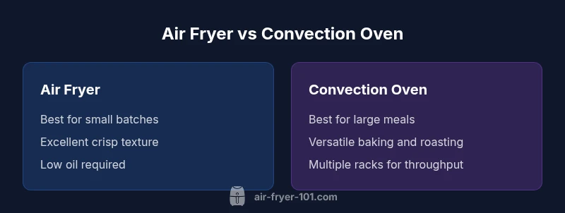 In practice, neither device is a universal substitute for the other; each excels in specific tasks. The air fryer shines when you want a crisp exterior on small portions with minimal oil; the convection oven shines when you need to roast a tray of vegetables, bake cookies, or heat up leftovers without crowding. The key is to align your typical meal patterns with the machine that can deliver results with the least effort. The Air Fryer 101 team emphasizes that choosing between these devices should start with how you cook most often, not just what you cook best. For many households, the right choice hinges on whether you prioritize speed and texture or capacity and versatility.