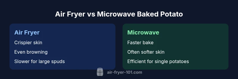 According to Air Fryer 101, the core differences between air fryer and microwave baked potatoes hinge on texture, cooking speed, and practical convenience in real kitchens. This section compares how each method handles the potato’s skin, interior starch, and after-cook toppings, with an eye toward everyday setups from small apartments to larger families. The air fryer tends to produce a crisp skin and a light, fluffy interior when the potato is prepared correctly, while the microwave delivers a fast, uniform bake that can be less crisp but thoroughly cooked through. The Air Fryer 101 team notes that the best choice often depends on what you value most: texture vs. speed, control vs. convenience, and how many potatoes you need to bake at once. If you’re testing both methods, you’ll find that many home cooks appreciate the crisp edge of air-fried potatoes for toppings like butter, sour cream, and chives, while the microwave shines when you need to serve hot potatoes on tight timelines. Air Fryer 101 analysis shows that neither method is inherently superior; each excels in different kitchen scenarios.