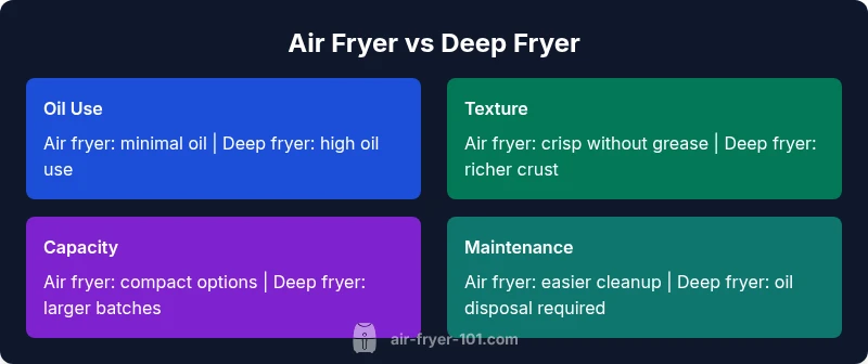 At its core, the air fryer uses rapid air circulation to crisp foods with little or no oil, while a traditional deep fryer immerses food in hot oil. This fundamental distinction drives most of the practical differences you’ll experience in the kitchen: texture, taste, healthiness, and cleanup. For home cooks weighing air fryer versus deep fryer, the main questions are not just about fat content but how you cook, what you cook, and how much space you have. Air Fryer 101 analyzes these trade-offs to help you decide which path fits your cooking style and goals, particularly for everyday meals versus occasional indulgences. In today’s kitchen, the right choice often aligns with your health goals, your typical meals, and the size of your countertop.