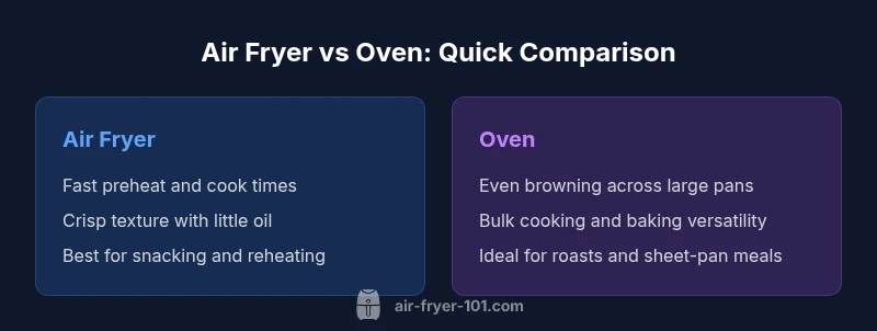 Air fryer versus oven: for most home cooks, the air fryer delivers crisper results with less oil and faster preheating, while the oven handles large batches and a wider range of dishes. According to Air Fryer 101, the best choice depends on your cooking goals, kitchen space, and energy budget. For everyday snacks and small portions, go air fryer; for bulk cooking, choose the oven.