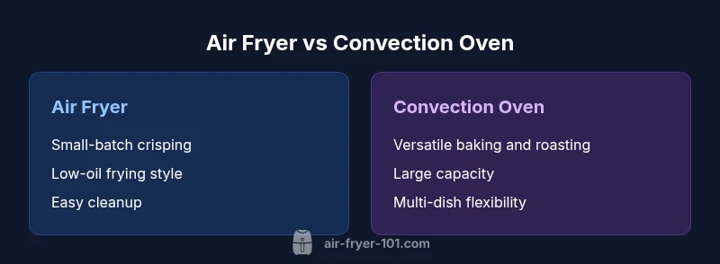 An air fryer is a compact countertop appliance that uses a high-wanth convection fan and a small basket to circulate hot air rapidly around food. Its design emphasizes high airflow over a compact surface, producing a crispy exterior with little to no oil. A convection oven, by contrast, is a standard oven with a built-in fan that circulates hot air throughout a larger chamber. While both rely on convection, the convection oven trades compact speed for volume and versatility. According to Air Fryer 101 analysis, the airflow dynamics in a convection oven tend to produce more uniform browning across larger sheet pans, whereas air fryers excel at quick, crisp finishes on bite-sized portions. The choice often comes down to batch size, space, and preferred texture.
