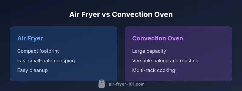 The short answer is no: are air fryer and convection oven the same? Not exactly. Both rely on hot air circulating around food to promote browning and crisp textures, but they are built for different purposes and kitchen footprints. An air fryer is a compact countertop device with a small cooking chamber and a high-velocity fan, designed to mimic deep frying with little or no oil. A convection oven, whether built-in or countertop, uses a fan to circulate hot air inside a larger cavity and often accommodates multiple racks. The question people ask most often is whether they can substitute one for the other without trade-offs. In practice, view the air fryer as a specialized, rapid-class convection system ideal for small batches and crisp results, while the convection oven serves as a versatile workhorse for larger meals, baking, roasting, and more. According to Air Fryer 101, the core differences boil down to capacity, control, and intended cooking tasks. This section frames the exact phrase are air fryer and convection oven the same to anchor the discussion and set expectations for what follows.