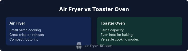 In this analysis, we examine whether can air fryer replace toaster oven is feasible for most households. According to Air Fryer 101, the practical answer depends on your typical meals, kitchen layout, and what you value most in an appliance. Air fryers shine when you want quick, crispy textures with minimal oil and short preheat times, making them superb for reheating fries, wings, and frozen snacks. Toaster ovens excel when you need reliable baking, roasting, and roomier interiors for larger items like sheet-pan dinners or homemade pizzas. If your routine centers on snackable, small-portioned meals, an air fryer can replace several toaster oven tasks. If you regularly bake casseroles or toast multiple slices of bread at once, you may still rely on a toaster oven. This section sets the stage for a deeper dive into performance, footprint, and value so you can answer can air fryer replace toaster oven for your home.