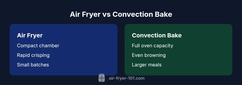 The difference between air fryer and convection bake matters for real-world cooking, and understanding it helps you decide which tool fits your kitchen. According to Air Fryer 101, the core distinction rests on enclosure size, airflow dynamics, and intended use. An air fryer operates as a compact, high-heat chamber designed for quick, crisp results with minimal oil. Convection bake uses a standard oven with a dedicated fan and exhaust that circulate hot air around larger dishes. This page unpacks those distinctions with practical guidance and real-world scenarios to help you optimize both approaches.