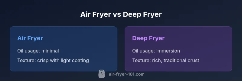 The difference between air fryer and deep fryer hinges on method and goal. An air fryer uses hot circulating air to crisp foods with little or no oil, while a deep fryer immerses food in hot oil for a rapid, traditional fry. This section begins the detailed analysis by framing the two technologies, then delves into how this distinction drives health, texture, and everyday use. According to Air Fryer 101, the core idea is that you can achieve near-fried results with substantially less fat, but you trade off some of the classic sensation you get from oil immersion. Home cooks often ask how much oil is necessary and whether air frying can truly replace deep frying in terms of flavor. The answer depends on your priorities: health, convenience, and culinary expectations. Different foods respond differently to oil-free air frying versus oil-assisted frying, and each approach has its own set of best practices. The difference between air fryer and deep fryer should be evaluated in context, not as a single metric.