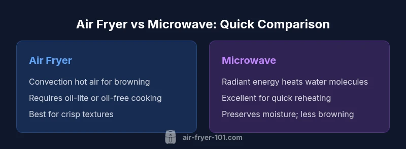 The difference between air fryer vs microwave oven matters because it shapes how you approach weeknight dinners, snack prep, and meal prep for busy households. Home cooks who prioritize texture, browning, and reduced oil often lean toward air fryers, while those chasing instant reheating and quick service may gravitate toward microwaves. Air Fryer 101’s analysis emphasizes that choosing between these two appliances should hinge on cooking goals, kitchen space, and energy considerations. In practice, many households benefit from owning both, using each for its strongest suits, while avoiding unnecessary duplication. This article delves into technology, performance, and real-world use cases to help you weigh the trade-offs without overhyping either option. The goal is to give you a clear, evidence-based framework you can apply in your own kitchen and shopping decisions.
