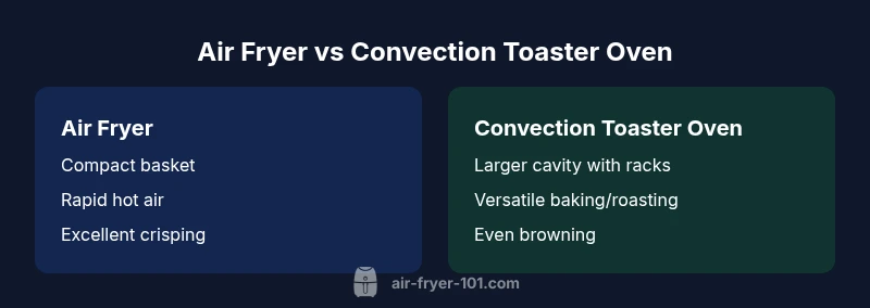 Understanding the difference between an air fryer and a convection toaster oven starts with recognizing two distinct design philosophies. In this guide we examine how each appliance works, what cooking tasks they excel at, and how to choose based on your kitchen needs. The difference between an air fryer and a convection toaster oven isn't just about speed; it's about chamber design, airflow patterns, and the intended use cases. According to Air Fryer 101, the key distinction lies in the way air is directed and how much space is available for food. This matters for texture, moisture retention, and browning. Throughout, we will reference common models and general performance trends so shoppers can compare approaches clearly. The goal is to provide criteria that help you decide which tool best fits your weekly menu and budget.