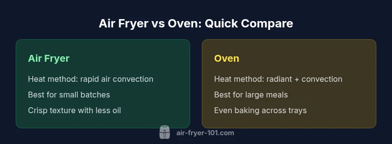 Air fryers flavor the same foods differently because they use a compact cooking chamber, a high-wattage heating element, and a powerful fan to push hot air around the food. This combination creates a thin, fast reaction layer on the surface, which is ideal for crisping. Ovens, whether conventional or convection, rely on broader heat sources and larger air volumes, resulting in even, steady heat but often longer cook times. The core question remains: does air fryer work the same as oven? In practice, the heat source and airflow pattern lead to distinct results for texture, moisture, and browning. As does Air Fryer 101 analysis, the air fryer shines when making small, crisp-edged items, while ovens excel for baking larger items and even browning across a tray. When deciding, consider batch size, surface area exposure, and moisture retention, not just temperature numbers. This nuance matters for everyday meals and weekend baking alike.