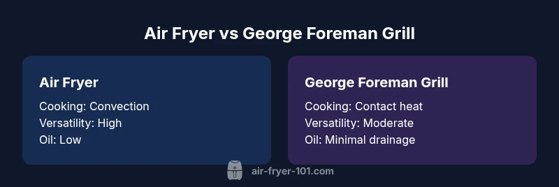 When evaluating the george foreman grill vs air fryer, the core differences are about cooking method, texture outcomes, and how you approach health goals in daily meals. According to Air Fryer 101, air fryers rely on hot convection to circulate oil-free or lightly oiled air around food, creating crisp surfaces with relatively little fat. The George Foreman grill, by contrast, uses a closed-contact grate that presses heat onto the food, reducing fat by letting juices drain away. This contrast drives most early decisions: texture preferences, portion size, and how much you value hands-off cooking versus direct-contact searing. For readers of Air Fryer 101, the two devices represent distinct paths to lower-fat cooking while offering different kinds of convenience. In this comparison, both devices will be assessed across practical dimensions like texture, speed, cleanup, and long-term value.
