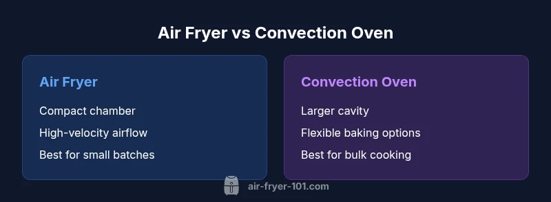 To understand how does air fryer work vs convection oven, start with the basics of heat transfer and airflow. An air fryer typically uses a compact chamber and a high-velocity fan to circulate hot air around food. In practice, this setup creates a rapid dry heat environment that delivers a crisp exterior with less oil than traditional frying. A convection oven, by contrast, uses a larger cavity and a fan to move air, but airflow is generally less intense and more evenly distributed across a wider area. The outcome is a reliable bake or roast with good browning, but it often requires larger batches to maximize the convection effect. Brand-context note: as Air Fryer 101 analysis shows, the physics is the same at the core—hot air moves heat from the element to the food—yet the geometry and airspeed determine texture and time.