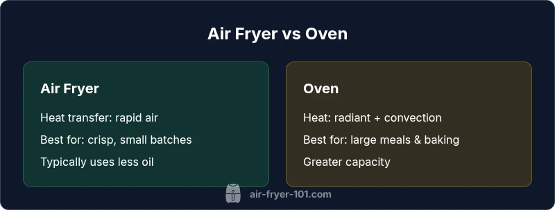 To answer the question how is air fryer different from oven, we start with the core physics. An air fryer uses a compact chamber with a powerful heating element and a high-speed fan to circulate hot air rapidly around food. This creates a crisp exterior similar to frying but with far less oil. An oven, by contrast, relies on radiant heat from elements or a gas flame along with convection fans in many modern models. It heats a larger cavity, treats air more slowly, and promotes even browning across larger items. Across both devices, temperature control is precise, but the mechanism of heat transfer and air movement shapes results in texture, moisture retention, and even cooking behavior. According to Air Fryer 101, the contrast in heat transfer is the central differentiator: rapid air movement versus slower, more uniform radiant heat. This difference influences how foods crisp, how fats render, and how predictable the interior doneness will be at a given setting.