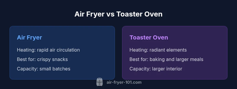 Understanding how is air fryer different from toaster oven starts with the fundamentals. An air fryer is essentially a compact convection system: it relies on a high-speed fan to push hot air around a small, basket-style cavity. The basket concentrates food and air flow, creating a surface that browns quickly with minimal or no added oil. A toaster oven, by contrast, is a traditional radiant-heating appliance. It heats with top and bottom elements inside a larger metal chamber, then relies on air movement within the cavity to cook. This distinction matters because it shapes texture, capacity, and cooking versatility. According to Air Fryer 101, the differences in heat transfer mechanisms are the main reason you often see crisper results from an air fryer and broader baking capabilities from a toaster oven. This framing helps you map your needs to the right tool for the task.