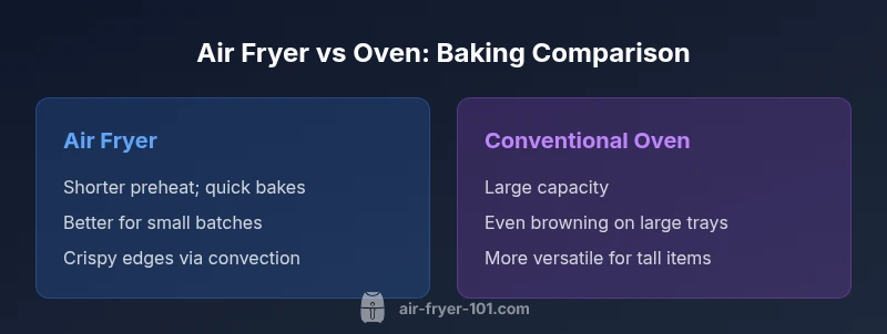 If your primary goal is quick, small-batch baking with a crisp finish, the air fryer is a strong candidate. If you regularly bake large trays, tall items, or rely on precise, even crumb, the oven remains the dependable option. Consider your kitchen setup: a single large oven benefits sheet-pan and loaf-style baking, while a compact air fryer complements quick experiments or after-dinner finishes. The right decision often isn’t choosing one device over the other; it’s pairing both to fit your menu. The Air Fryer 101 team suggests evaluating your typical recipes, batch sizes, and desired textures to determine how to allocate tasks between tools. For many households, a hybrid approach yields the best of both worlds, with the oven handling large, classic bakes and the air fryer delivering fast, crispy results for small treats. Authority sources reinforce the idea that practical baking success comes from matching technique to equipment, not from relying on a single method.