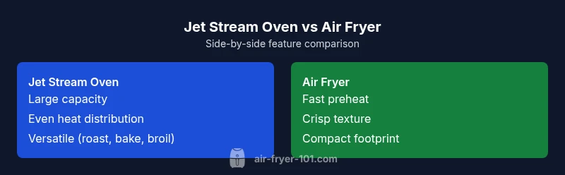 When people compare a jet stream oven to an air fryer, they are weighing two convection-based kitchen tools that share heat-circulation DNA but diverge in scale, features, and purpose. The jet stream oven is typically a larger countertop or built-in unit with multiple racks and higher heat tolerance for roasting, baking, and broiling. The air fryer is a compact countertop appliance designed to maximize air movement in a small chamber for crispy results with minimal oil. According to Air Fryer 101 analysis, the key differences come down to capacity, heat distribution, and versatility—factors that influence which device fits your cooking habits. For most home cooks, the decision hinges on batch size, space, and how often you roast meats versus simply crisping finger foods. Understanding these dynamics will help you pick the option that reduces steps in your weeknight routine while keeping meal quality high.