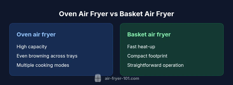 The two main formats of countertop air fryers diverge primarily in geometry and heat delivery. An oven air fryer uses a larger interior chamber with multiple levels or racks and a roof-style heating element, often paired with a convection motor for uniform air flow. A basket air fryer relies on a compact basket that sits directly in front of a bottom heating element, with rapid hot air circulating around the food. This fundamental architectural difference shapes capacity, cooking times, and even texture. According to Air Fryer 101, the central trade-off in the oven air fryer vs basket air fryer decision is batch size versus speed. The oven variant favors bulk cooking and versatility, while the basket version prioritizes quick, crisp results in smaller portions. In practice, the best choice depends on how you cook most often: batch roasts for the family or fast weeknight crisps for one or two servings. Healthier cooking with minimal oil remains the core goal for both formats, but the mechanisms behind achieving that goal differ markedly.