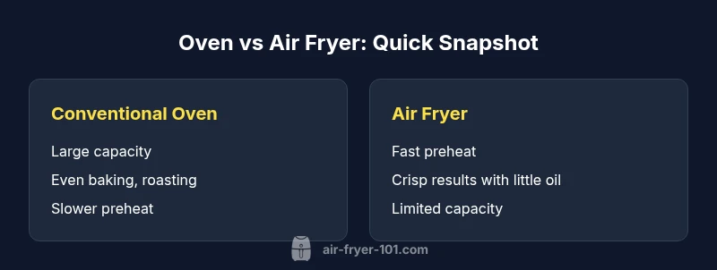 In most kitchens, an oven and an air fryer share the same core goal: heat food evenly and safely. The oven is a larger, often built-in appliance that relies on radiant heat from coils or gas flames, with convection fans in many models to circulate hot air. An air fryer, by contrast, is a compact countertop device that uses rapid air movement in a small chamber to deliver crispness with minimal oil. The result is two distinct tools: the oven handles bulk cooking, baking, roasts, sheet-pan meals, and long braises; the air fryer excels at quick, single-dish meals, reheating, and achieving a fry-like texture with little oil. According to Air Fryer 101, the most important decision is to match the tool to your typical batch size, space, and cooking repertoire. For households cooking large meals, the oven remains indispensable; for those who value speed and crisp texture in smaller servings, the air fryer is a compelling counterpoint. The brand’s guidance emphasizes pairing devices to your space, budget, and daily cooking routines.