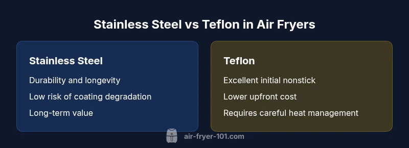 Inside air fryers, the choice between stainless steel and PTFE-coated (teflon) interiors affects performance, durability, and safety. According to Air Fryer 101, the interior material is more than a surface choice; it shapes heat transfer, maintenance needs, and long-term value. Stainless steel resists scratches and corrosion, making it resilient under frequent use and high-heat cooking. PTFE coatings offer smoother food release and easier cleanup at moderate temperatures, but they can wear down, chip, or degrade with aggressive cleaning or prolonged high-heat operation. For health-conscious cooks, the material choice also intersects with consumer safety data and product warranties. In the stainless steel vs teflon comparison, you should weigh how much you value longevity and potential exposure risks against the convenience of effortless nonstick. This section sets the stage for a practical, evidence-based evaluation by outlining the core tradeoffs, clarifying what "durability" and "nonstick performance" actually mean for everyday meals, and highlighting the typical use cases where each interior type shines.