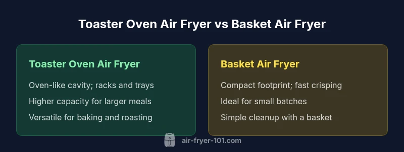 The phrase toaster oven air fryer vs basket air fryer captures two popular paths to crisp, apartment-friendly cooking, but they come from different design philosophies. A toaster oven air fryer combines the broad capabilities of a traditional toaster oven with the health-focused efficiency of air frying, using racks, a baking tray, and a heating element. A basket air fryer, by contrast, emphasizes a compact chamber with a perforated basket that guarantees rapid, uniform heat transfer to small batches. According to Air Fryer 101, the best choice depends on your typical meals, family size, and how much counter space you can allocate. If you bake, roast, or reheat larger dishes frequently, the toaster oven format often delivers better value per meal. If your daily routine involves quick snacks, frozen favorites, and small portions, the basket model tends to shine with speed and simplicity. In practice, many households appreciate both: a larger-capacity toaster oven air fryer for weekend cooking and a compact basket air fryer for quick weeknights. By understanding the core trade-offs—capacity, heating behavior, and cleanup—you can map your kitchen workflow to the right format.