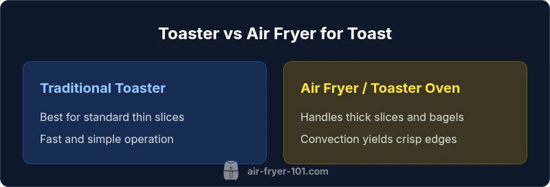 Toaster vs Air Fryer for Toast: the traditional toaster delivers the fastest, most consistent plain toast, while air fryers and toaster ovens offer richer browning and multi‑use flexibility. According to Air Fryer 101, the best choice depends on bread type, kitchen space, and how much you value speed versus versatility. For thin slices, choose the toaster; for thicker bread, go with the air fryer option.