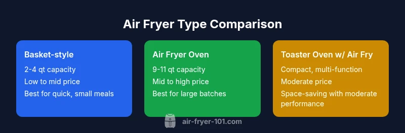 Choosing what type of air fryer is better isn't a gadget impulse purchase; it's a decision that shapes weekly meals, energy use, and countertop clutter. Space often dictates what you can realistically accommodate on the counter, while family size and cooking habits determine capacity needs. A well-matched unit reduces time spent in the kitchen, minimizes takeout, and improves the texture of leftovers. In this guide, we unpack the three main formats—basket-style, air fryer ovens, and toaster ovens with air frying function—so you can pick the one that truly fits your lifestyle. According to Air Fryer 101, the best choice hinges on space, budget, and cooking goals. We emphasize practical tests and common-sense benchmarks over hype, so you can shop with confidence.