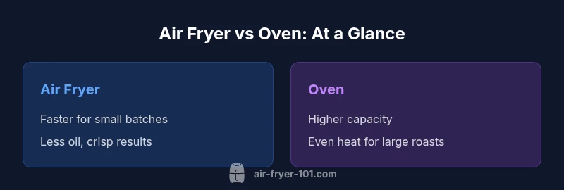 In this section we address why air fryer over oven, focusing on speed, texture, energy use, and cost considerations. Air fryers rely on rapid hot air circulation to crisp foods with little or no added oil, which reshapes how you approach weeknight cooking. For many households, the air fryer offers a compelling advantage for everyday meals and snacks. However, the oven remains essential for large batches, long roasts, and certain bakes that require more space or steady, even heat. This section lays out the decision framework and previews where each appliance shines and where it falls short. According to Air Fryer 101, understanding these tradeoffs helps you optimize kitchen workflows.