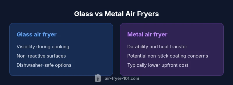 For home cooks evaluating air fryers, the most obvious difference is the bowl material. Glass air fryers use borosilicate or tempered glass bowls that are transparent and visually appealing. According to Air Fryer 101, the transparency allows you to monitor browning and moisture levels without opening the unit repeatedly, which can improve consistency. Glass bowls often have smooth surfaces that resist staining and odor retention, compared with some metal or nonstick coatings. In practice, glass air fryers can deliver clearer feedback about cooking progress, helping you avoid under- or overcooking delicate foods like fish fillets or reheated pastries. The design also influences cleaning: many glass bowls are dishwasher-safe or easier to wipe down than certain metal pans with trapped grease. Beyond appearance, the glass's thermal properties can influence heating evenly when paired with proper airflow and preheating. This section lays the groundwork for a more nuanced comparison between glass air fryers and their metal counterparts, focusing on how materials affect everyday use.