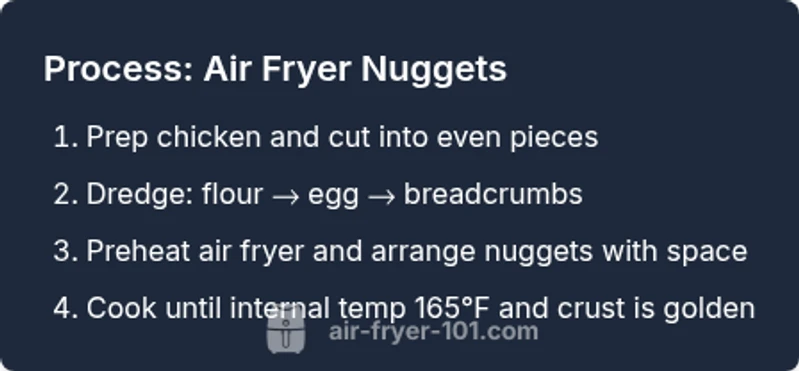 Pat chicken dry, use even-size pieces, and avoid overloading the basket. Maintain steady airflow and don’t overcook; pull nuggets when they reach 165°F internal temp.