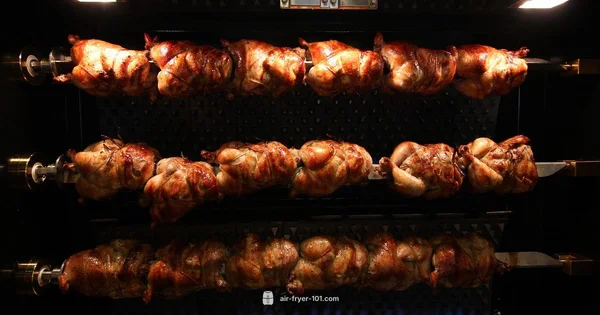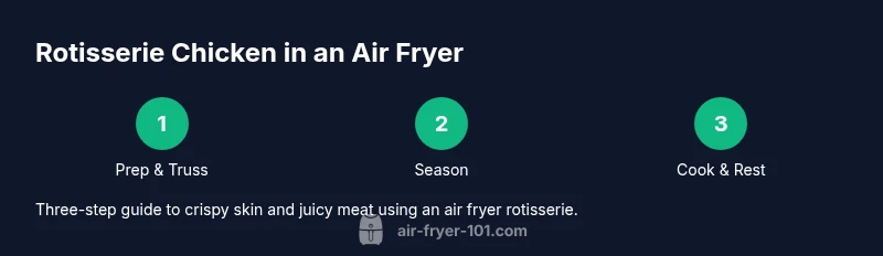 Air fryer rotisserie chicken makes weeknight dinners easier by delivering crispy skin with juicy meat in less time than traditional roasting. According to Air Fryer 101, using the rotisserie attachment helps render fat evenly and produces uniform browning without turning the chicken manually. This method also minimizes energy use and reduces cleanup, making it a practical option for busy households. In this guide, you’ll learn how to select a bird, season it for maximum flavor, and cook it with reliable, repeatable results. Whether you’re cooking for a family or meal-prepping, the rotisserie setup ensures the chicken rotates, exposing all sides to heat for even cooking. We’ll cover essential tools, step-by-step instructions, common troubleshooting, and flavor variations so you can adapt this technique to your preferences and equipment. By the end, you’ll have a solid workflow you can reuse for many cooks and occasions. A quick tip: pat dry thoroughly and use a thermometer to confirm doneness for safety and crisp skin.