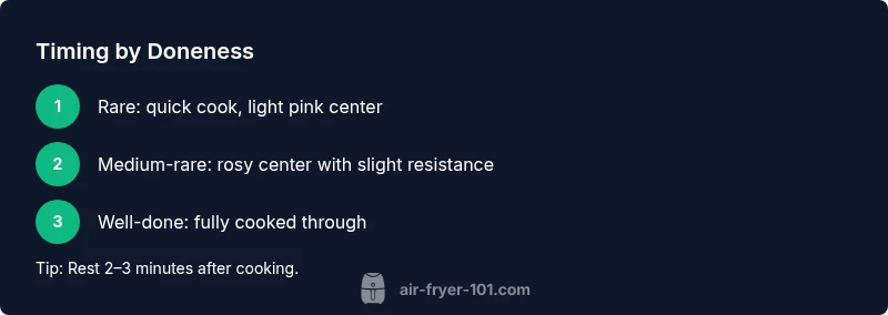 Timing is the silent chef in any air fryer steak recipe. The moment you hit start, you begin a balance between heat, crust formation, and moisture retention. A precise window prevents overcooking and preserves the steak’s natural juices, especially in the center. According to Air Fryer 101, accuracy in timing helps you reproduce restaurant-like results at home, while also reducing guesswork and waste. The modern air fryer concentrates heat and circulates it rapidly, so even small deviations in time or temperature can lead to significantly different textures. By understanding the factors that influence cook time, you empower yourself to tailor each cook to the steak’s thickness, cut, and your preferred level of doneness. This approach makes “air fryer steak time” a dependable recipe rather than a lucky hit.