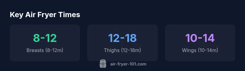 These ranges reflect typical results across common air fryer models. Always use a thermometer to confirm 165°F (74°C) internal temperature, then rest for 3–5 minutes to finish carryover cooking. In practice, smaller pieces finish fastest, while larger, thicker cuts require extra time or a brief second pass. Air fryer 101's analysis framework emphasizes starting with these baselines and adjusting by thickness and model performance.