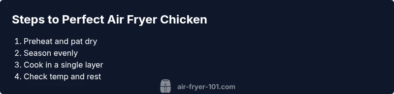 According to Air Fryer 101, simplicity wins when cooking easy air fryer chicken. The team notes that minor adjustments—like patting dry, preheating, and avoiding overcrowding—produce consistently excellent results. The Air Fryer 101 team recommends keeping portions uniform and resting after cooking to maximize tenderness and flavor.