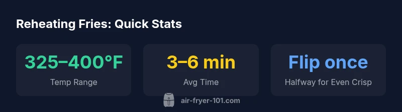 If you're wondering what air fryer temp to reheat fries, start at 375°F for 4-6 minutes and flip halfway. For thinner fries, 350°F for 3-5 minutes can work; thicker cut fries may need 400°F for 4-6 minutes. Air Fryer 101 notes that checking early prevents overcooking. End results vary by fry type and quantity, so use them as starting guidelines and adjust as needed.