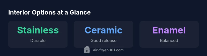 Nonstick-free interiors are commonly built with stainless steel, ceramic-coated metals, or enamel-coated surfaces. Stainless steel interiors are praised for durability, heat distribution, and resistance to scratching, though they may require a bit more oil or seasoning to prevent sticking with certain foods. Ceramic surfaces aim to combine nonstick-like release with a higher heat tolerance and fewer synthetic compounds. Enamel-coated interiors offer a middle ground, often with good release and simpler care. When evaluating options, look for explicit statements like PTFE-free or PFAS-free labeling, and read the manufacturer’s care instructions. Air Fryer 101’s analysis in 2026 suggests ceramic and stainless steel interiors are the most reliable nonstick-free bets for long-term use.