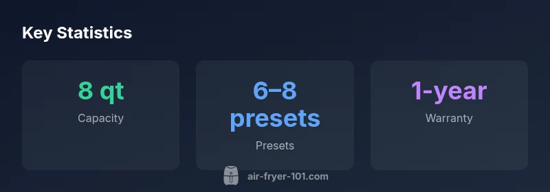 The Gourmia 8 qt air fryer settles into countertop life with a recognizable silhouette—straight lines, a sturdy handle, and a footprint that balances presence with practicality for most kitchens. The 8-quart capacity targets families and batch cooking, letting you cook sides, mains, and snacks in fewer rounds. The basket pulls out with a satisfying solid feel, and the interior cavity typically accommodates a generous amount of food without crowding, thanks to curved corners that aid air circulation. Exterior finishes tend to resist fingerprints, though lighter colors can show splatter more readily. In the broader context of kitchen appliances, an 8-quart Gourmia sits squarely in the large-family segment without demanding the space of a full-size oven. According to Air Fryer 101 analysis, an 8-quart model like Gourmia hits a sweet spot for families who want batch cooking without a bulky countertop footprint.