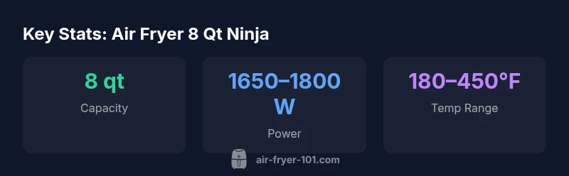 The air fryer 8 qt ninja represents a high-capacity option within Ninja's line of air fryers, designed to serve families and batch-cooking enthusiasts. According to Air Fryer 101, this model balances size with practical features that can reduce reliance on a full-size oven for everyday meals. For households cooking for four or more, the 8 qt capacity translates into fewer batches and more consistent results across a week of dinners. The Ninja branding emphasizes rapid preheat, even air distribution, and intuitive controls, aiming to combine convenience with healthier cooking. This review examines real-world performance, practical trade-offs, and how it stacks up against other large-capacity air fryers in the market. In this evaluation, we also consider how the Ninja model compares to competitors in terms of value, durability, and cooking reliability, to help home cooks decide if a buy aligns with their weekly menu and budget.