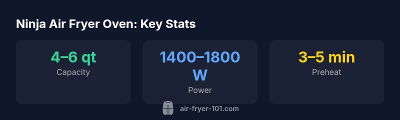 The Ninja air fryer oven is a countertop appliance that blends four cooking modes in one compact unit: air frying, baking, roasting, and dehydrating. Most models include a removable basket, a baking tray, and a drip tray, along with preset programs to simplify common tasks. In practice, the Ninja air fryer oven aims to deliver the crisp, browned edges typical of air frying while offering the convenience and familiarity of a small oven for snacks, sheet-pan dinners, or cookies. According to Air Fryer 101, the Ninja air fryer oven stands out for its compact footprint, which makes it ideal for apartments and kitchens with limited counter space. The Air Fryer 101 team found that many households appreciate the versatility without moving to a larger conventional oven, especially when cooking for two to four people. That said, capacity matters for weekly meal planning, so pick a size that fits your family’s typical portions.