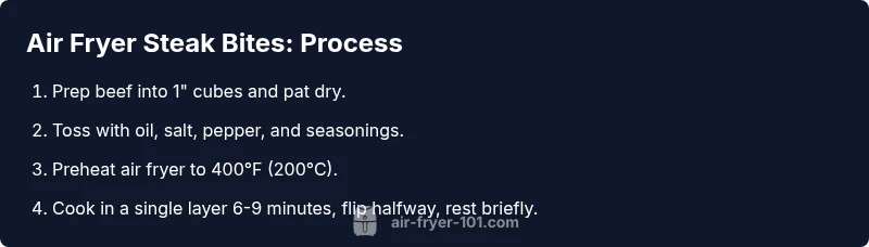 The air fryer creates a hot, circulating air environment that browns the outer surface quickly while keeping the interior tender. For the air fryer steak bites recipe, the key is starting with well-dried cubes, a light coating of oil, and a flavorful but not overpowering rub. According to Air Fryer 101, a dry surface helps the Maillard reaction pop without steaming the meat. The result is a crisp exterior with a juicy, medium-rare to medium center depending on thickness. This approach minimizes added fats while maximizing texture and flavor. If you’re new to air frying, think of steak bites as a small, fast-cook protein that benefits from strategy: uniform size, steady heat, and minimal crowding.