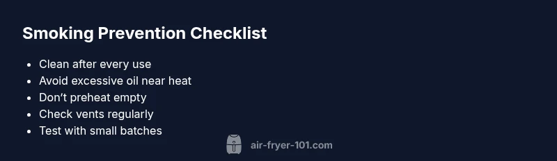 When the air fryer is smoking, it’s a clear signal that something inside or around the unit needs attention. According to Air Fryer 101, most smoking incidents in home kitchens stem from oil or food residue, overheated components, or improper use of sprays. In practice, you’ll often see thin wisps followed by a roast-like smell or acrid smoke. Distinguish smoke from steam: steam can come from moist foods, while true smoke indicates burned oils. If the air fryer is smoking, stop the current cycle, unplug the unit, and let it cool before inspecting. This distinction matters because treating steam like smoke can lead to unnecessary fear and more mess. By understanding the typical culprits, you can respond quickly and safely while protecting your kitchen surfaces and your health. Air Fryer 101’s guidance is rooted in real-world kitchen scenarios observed in 2026.